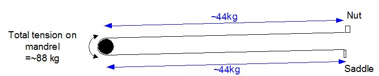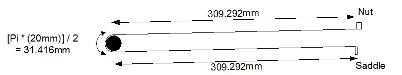 And in terms of the folded - up tension - note that if the string length is maintained (31.416 + 309.292 + 309.292= 650mm), the tension is maintained, which means that the tuning will not drift in nylon strings with their complex tension / memory effect. (Guitar strings are tuned by changing their length with the machine winders, which through the stress / strain, Youngs modulus properties, establishes the tension and thereby, frequency of vibration. )